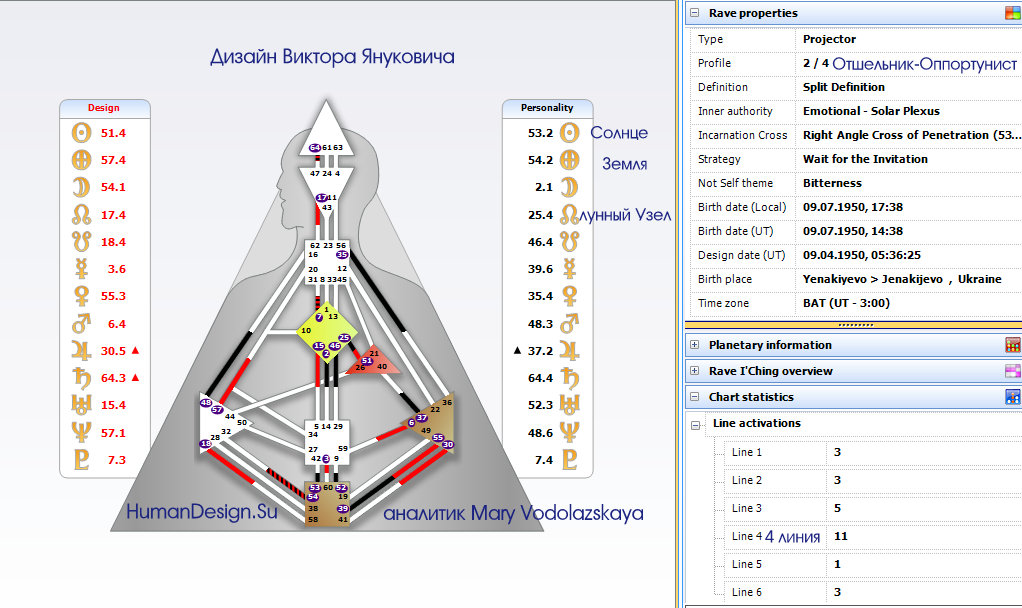 Перед нами карта Проектора. Это значит, что для Виктора Януковича важно быть признанным руководителем. Которого пригласили на роль направляющего. Избрали, но вёл себя плохо – значит, переизбираем. «Ты не можешь нас направлять, нам нужен другой. Ты нам не нравишься, уходи. Ты надоел нам». Горько проектору Януковичу. Он не хочет уходить. Тут и сеть многое значит, это же проектор профиля 2/4. 2 линия Отшельника это всегда дар и проекции на эти дары и таланты. Что же можно усмотреть здесь? 2 линия на стороне Личности – Рост и Амбиции, 54 и 53 ворота. Они в корневом адреналине давления. Это адреналин роста амбиций. Никакой осознанности, просто стресс от того, что амбиции растут, как раковая опухоль. Беспощадно.